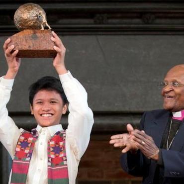 Kesz a reçu le prix des mains de Desmond Tutu, grand défenseur des droits des enfants.